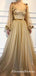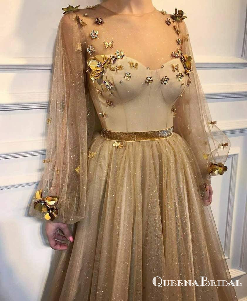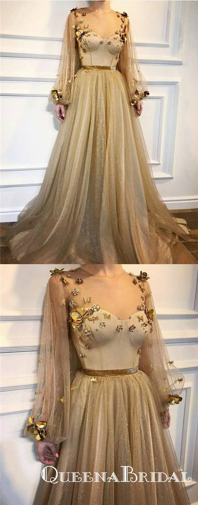 2019 Chic Scoop Long Sleeve Gold Long Cheap Prom Dresses With Applique, QB0606