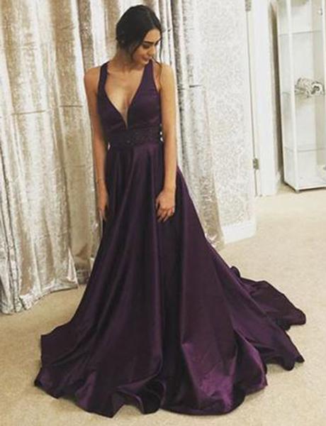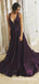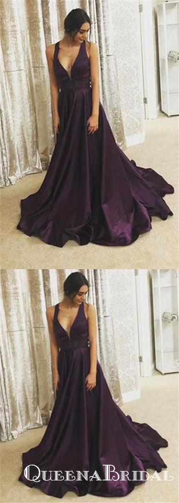 A-Line V-Neck Long Grape Satin Cheap Prom Dresses with Beading, QB0689