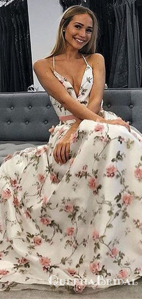 A Line V Neck Spaghetti Straps Flower Lace Long Prom Dresses, QB0586