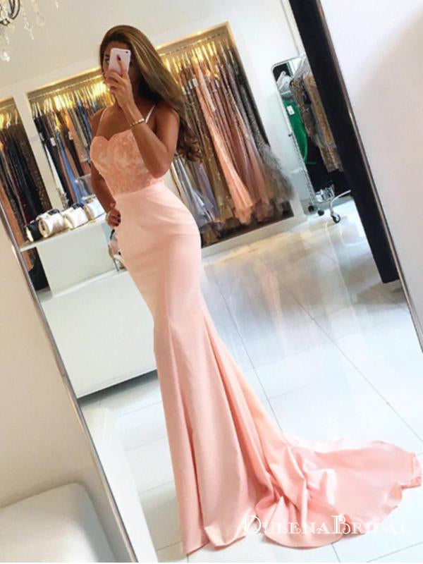 Applique Beaded Long Mermaid Spaghetti Straps Formal Prom Dresses, QB0610