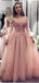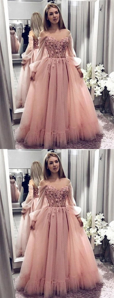 Pink Off The Shoulder Long Sleeve Long Cheap Tulle Prom Dresses With Applique, QB0611