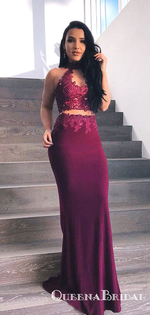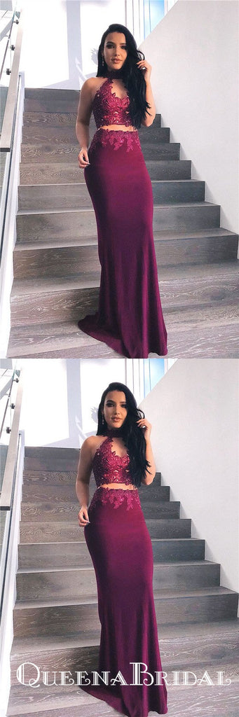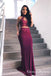 Sheath Round Neck Keyhole Burgundy Stretch Satin Prom Dresses with Appliques, QB0683