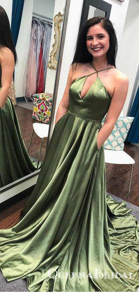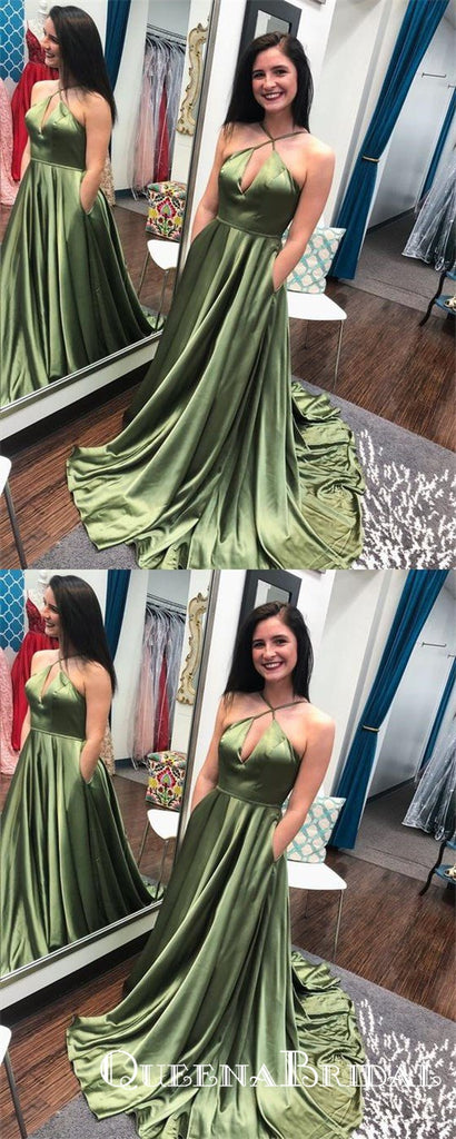 Simple Halter Long Elastic Satin Cheap Prom Dresses with Keyhole, QB0614