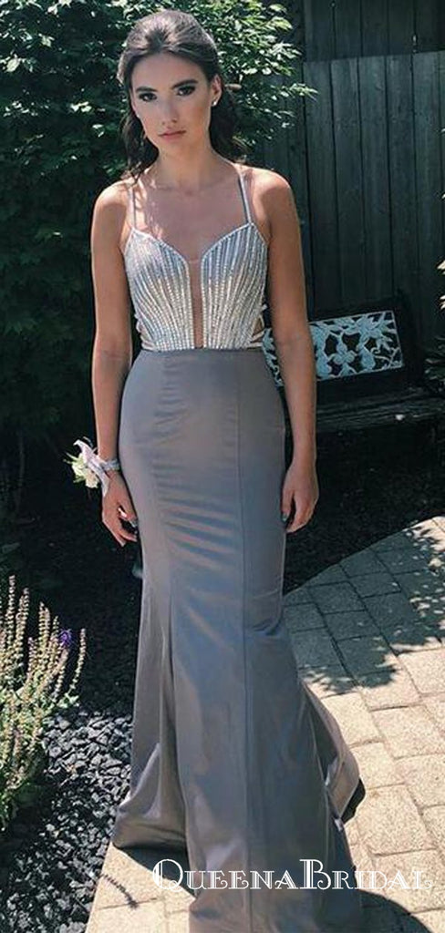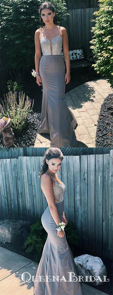 Spaghetti Straps Grey Open Back Mermaid Evening Prom Dresses With Beading, QB0617
