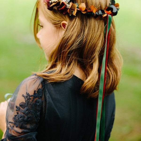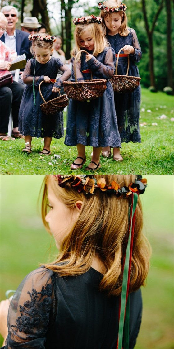 Cute Round Neck Long Sleeves Dark Blue Lace Long Cheap Flower Girl Dresses, QB0109