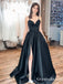 A-Line Black Satin Spaghetti Straps V-neck Simple Long Cheap Formal Prom Dresses with Pockets, PDS0038
