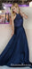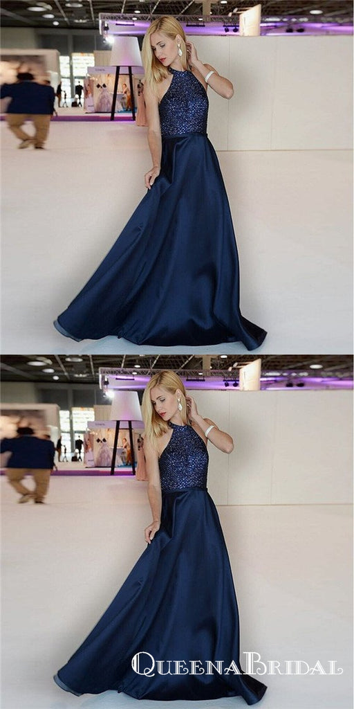 A-Line Halter Long Cheap Navy Blue Prom Dresses with Beading, QB0523