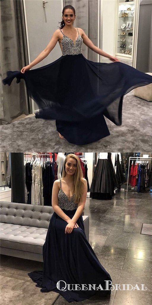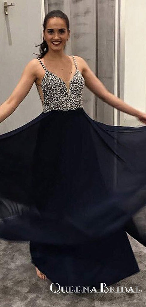 A-Line Spaghetti Straps Long Navy Blue Prom Dresses with Beading, QB05