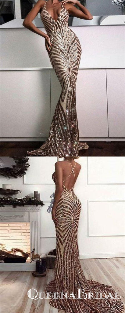 Elegant Spaghetti Straps Gold Sequined Mermaid Long Formal Prom Dresses, QB0580