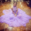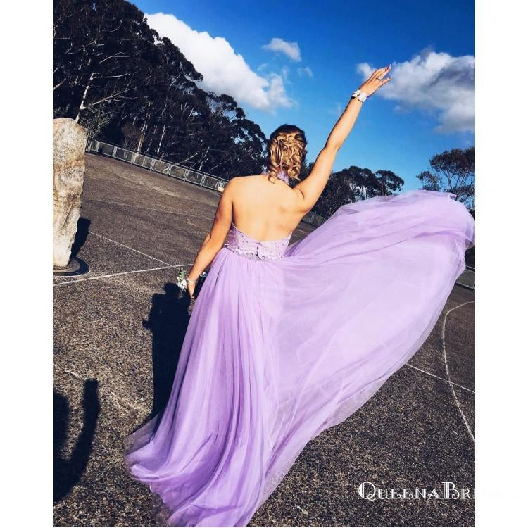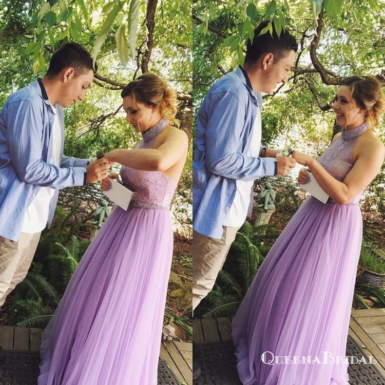 Lavender Halter Long Cheap Tulle Prom Dresses With Lace and Beaded, QB0546
