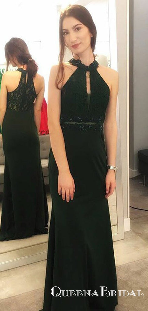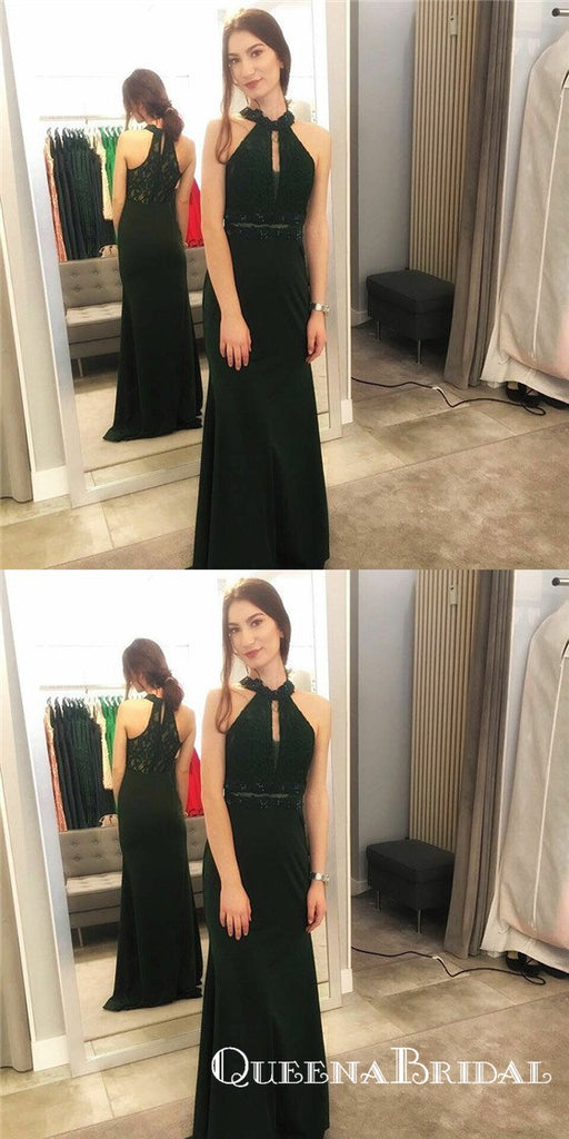 Mermaid Halter Long Dark Green Prom Dresses with Lace Keyhole, QB0515