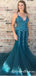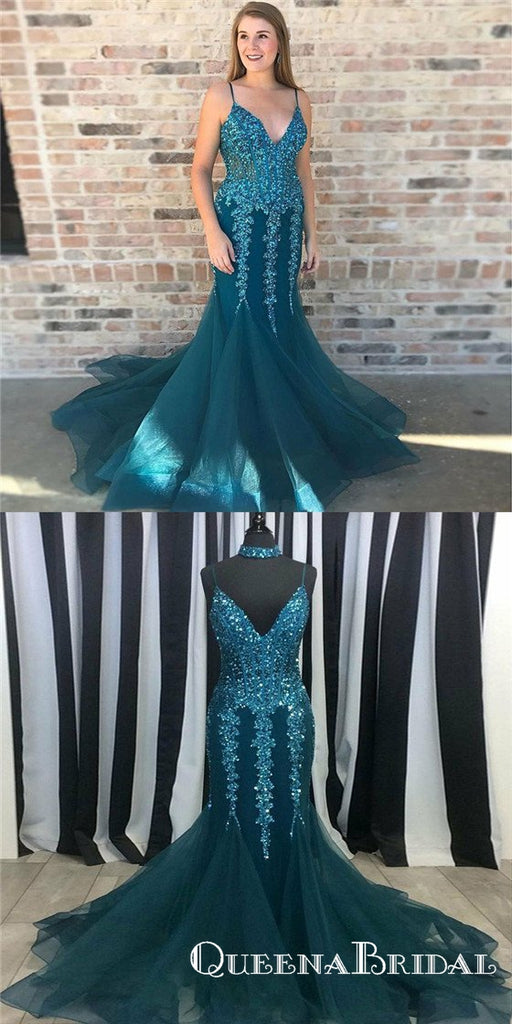 Mermaid Spaghetti Straps Turquoise Prom Dresses with Appliques&Beaded,