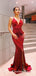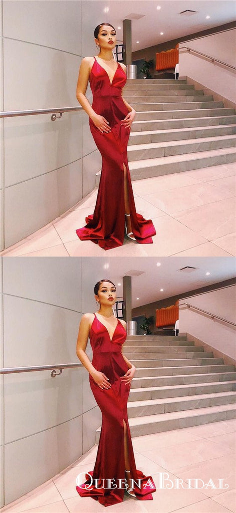 Sexy Mermaid V Neck Spaghetti Straps Red Satin Long with Split Prom Dresses, QB0565