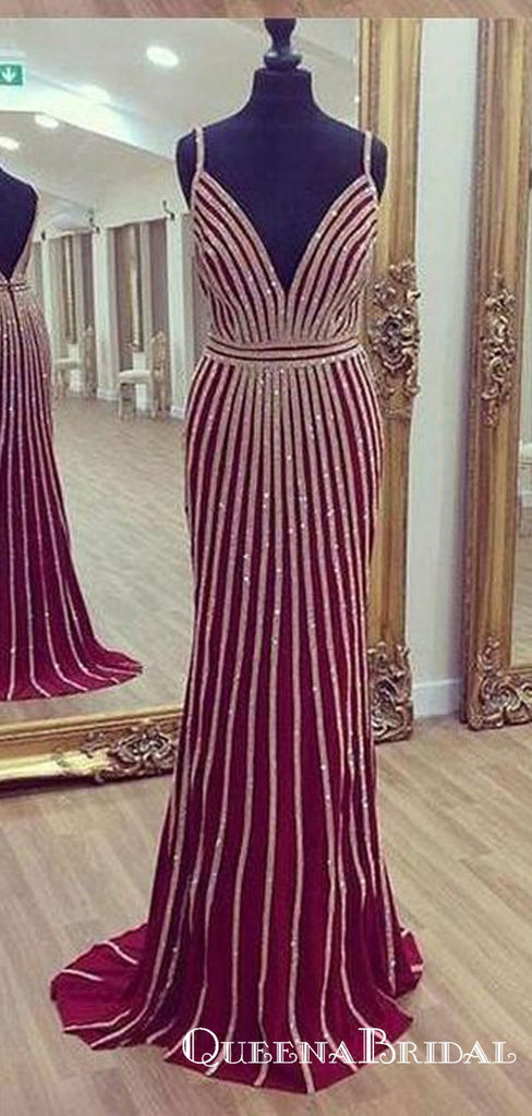 Sexy Red Spaghetti Strap V-neck Long Cheap Prom Dresses With Beaded, QB0560